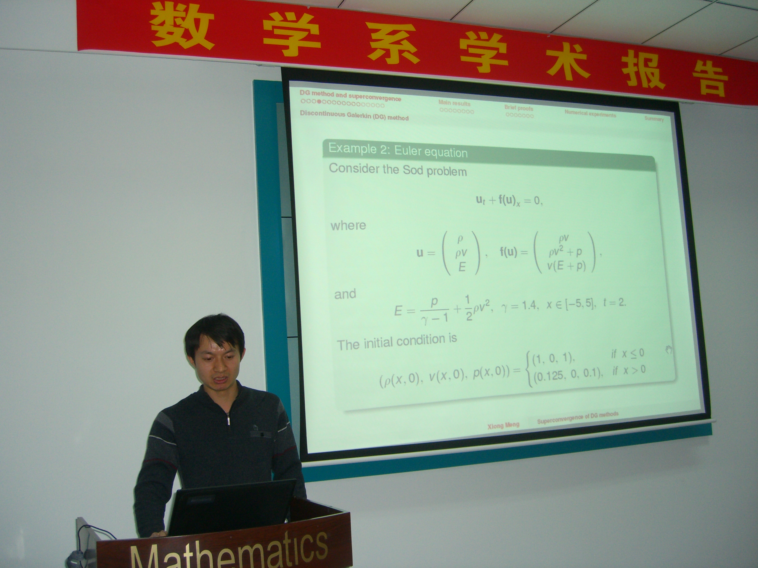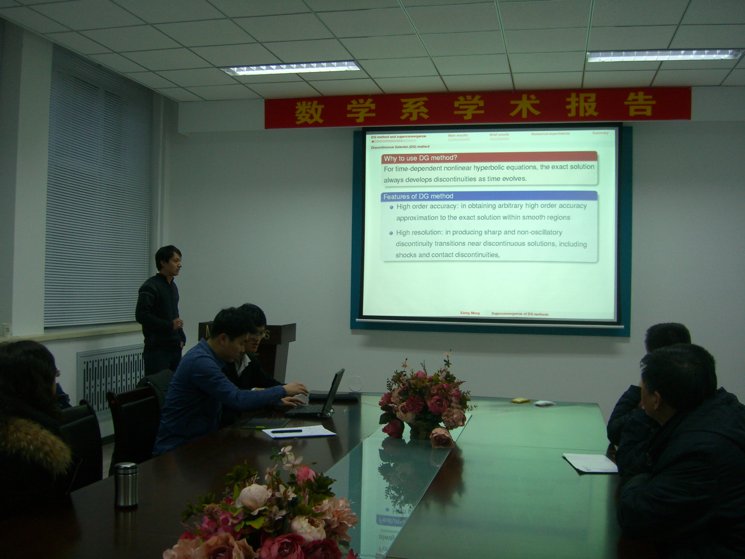 2014年2月28日下午15:00时,我校数学系计算数学研究所孟雄博士在格物楼503做了题目为:《Superconvergence of discontinuous Galerkin method for scalar nonlinear conservation laws in one space dimension 》的学术报告,报告由计算数学研究所李道华副教授主持。数学系二十余位师生听取了学术报告并进行了热烈讨论。
