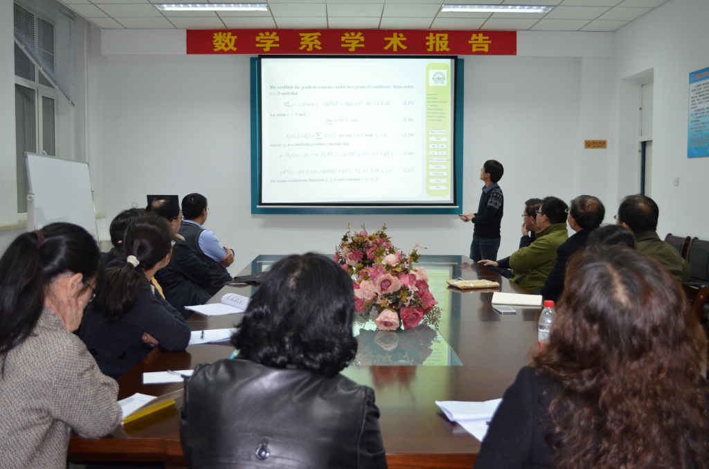 20141017日下午16:00时,我校数学系概率统计与运筹控制研究所教师矫贺明格物楼503做了题为 Regularity for an obstacle problem of Hessian equations on Riemannian manifolds》的学术报告,报告由数学系包革军教授主持。数学系二十余位师生听取了学术报告并进行了热烈讨论。