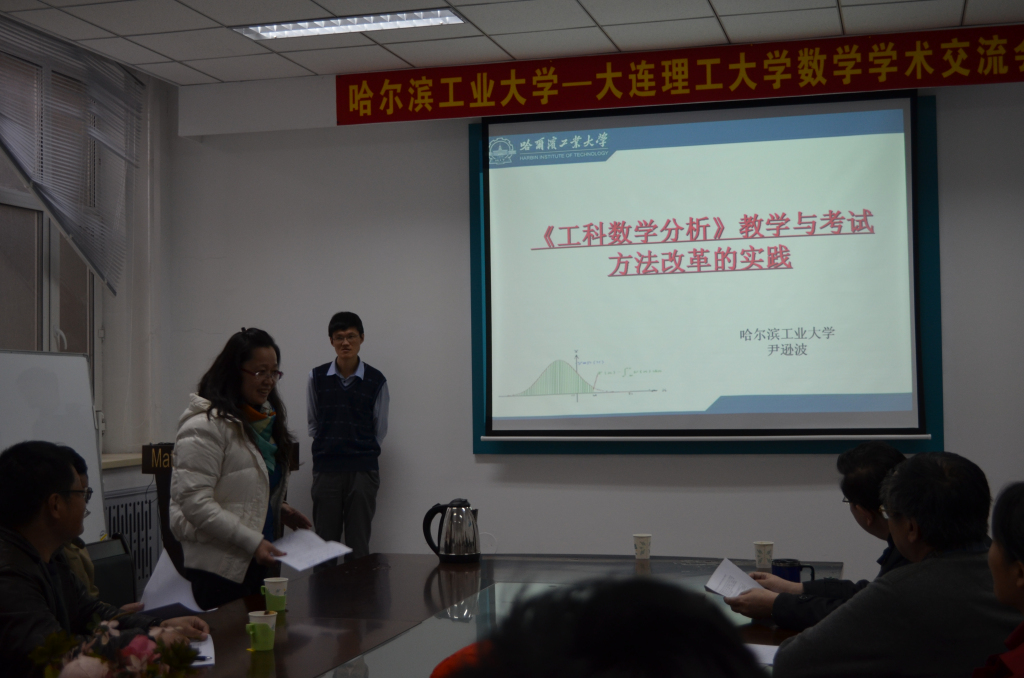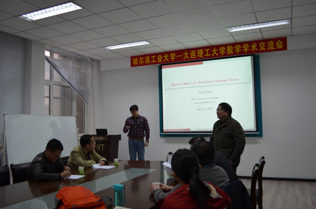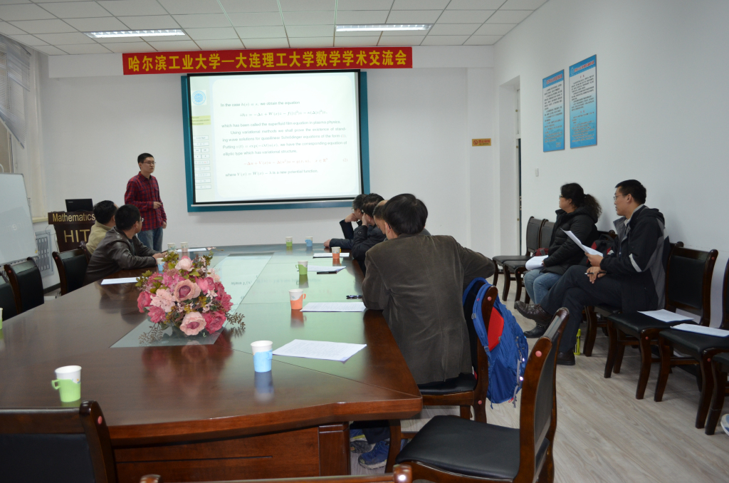 2015年4月11日,哈尔滨工业大学-大连理工大学数学学术交流会在哈尔滨工业大学数学系会议室举行。大连理工大学数学学院院长卢玉峰教授、书记刘西民教授等十多位教师,哈工大数学系吴勃英教授、付永强教授等二十余位师生参加了本次学术交流会。交流会开幕仪式由付永强教授主持,大连理工大学卢玉峰教授和哈工大数学系吴勃英教授先后为交流会致辞,并介绍了本校数学学科的发展现状和趋势,指出两校数学有很多共同点,以及对两校数学学科的进一步交流和发展进行了展望。开幕式结束后,两校的代表做了9场精彩的报告,双方就各自感兴趣的问题进行了探讨,在座师生都表示受益匪浅。 本次学术交流会成功的在学术成果、教科研管理和人才培养等方面进行了交流,彼此增强了共识,增进了两校数学的友谊。在双方教师的共同努力下,本次交流会圆满结束!