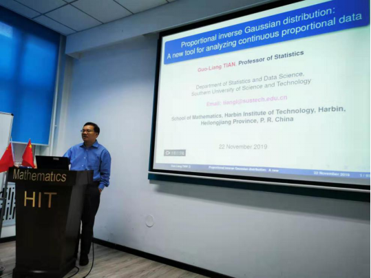 应数学学院田波平教授邀请,2019年11月22日上午,南方科技大学统计与数据科学系田国梁教授到访我校并作学术报告。田国梁教授在格物楼503报告厅为大家带来题为“Proportional inverseGaussian distribution: A new tool for analyzing continuous proportional data”的精彩学术报告。学院近30余名师生参与了此次报告会。