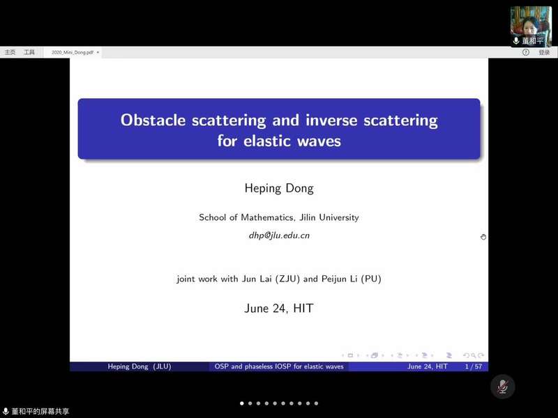 应数学学院郭玉坤副教授邀请,吉林大学数学学院董和平副教授于2020年6月24日上午10:00-11:30为我院做了一场在线学术讲座。报告的平台为腾讯会议,会议ID为812 894 313。董老师以Obstacle scattering and inverse scattering for elastic waves为主题为我校师生做了一场精彩的学术报告,介绍了弹性波障碍散射问题的积分方程方法和无相位反散射问题的参考球算法等前沿课题和最新进展。报告由郭玉坤副教授主持,三十余名师生参加了此次在线学术活动,并在会议平台与董老师进行了热烈的交流与讨论。