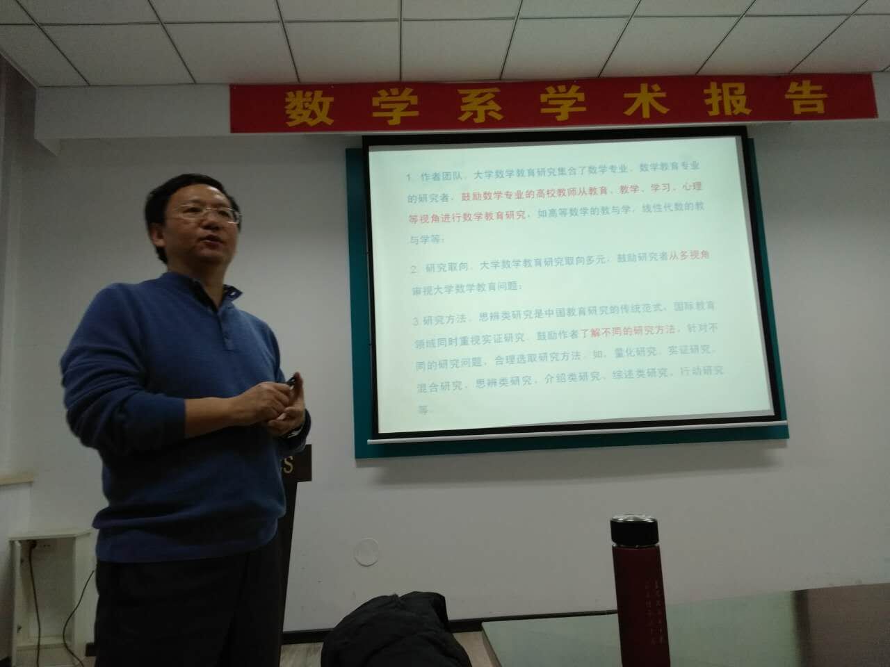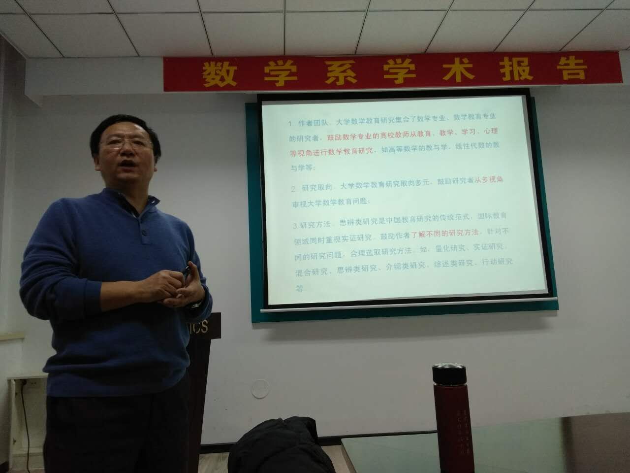 2017年1月15日 下午13:30,天津师范大学王光明教授在格物楼503会议室做了精彩的报告,题目为:《大学数学教育研究》,报告由孙杰宝副教授主持,数学系30余位师生听取了报告,并进行了热烈的讨论。