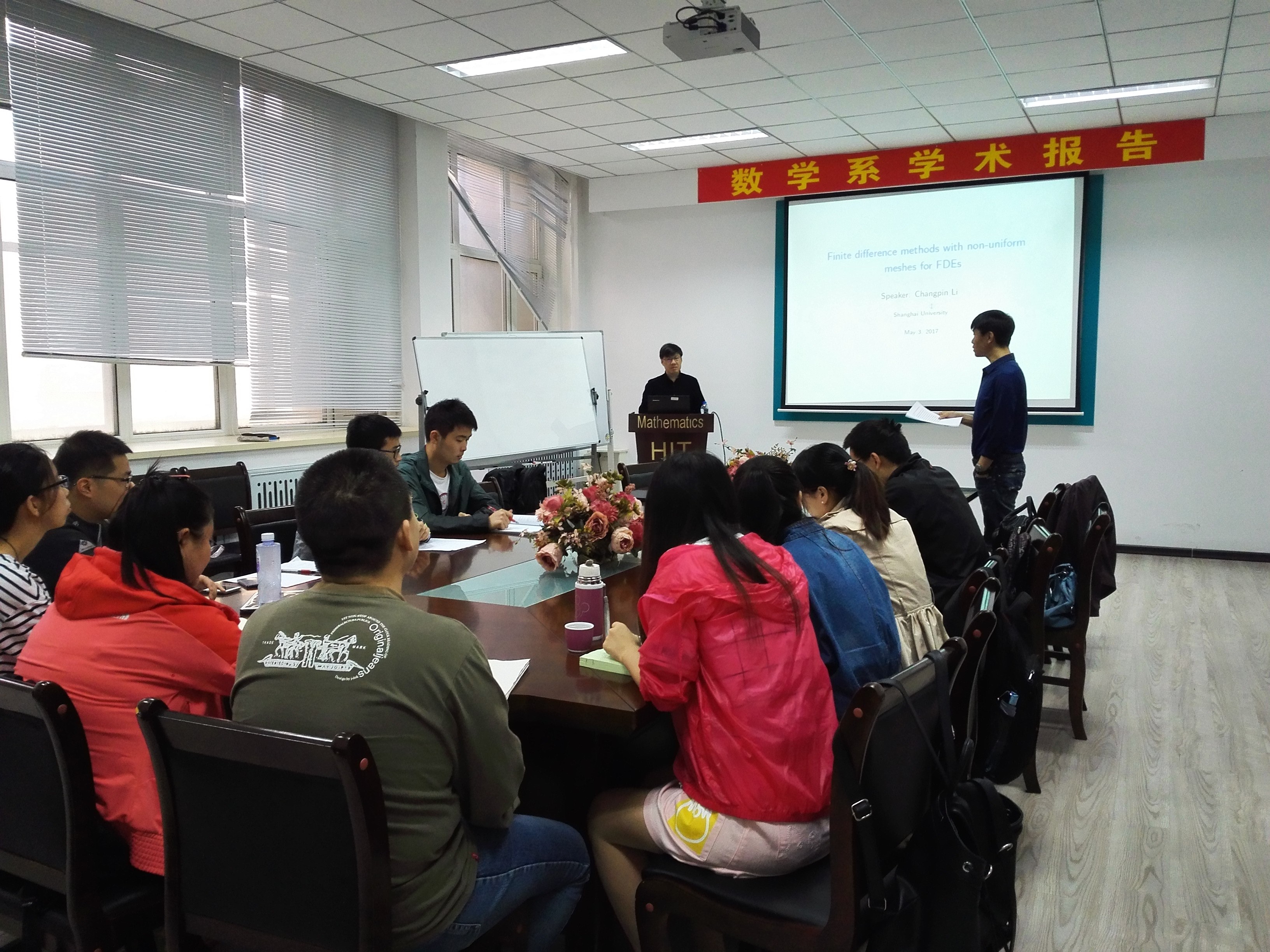 应哈尔滨工业大学数学系赵景军教授的邀请,2017年5月3日 上午9:00-10:00在格物楼503,上海大学李常品教授来访数学系并做学术报告。报告题目:Finite difference methods with non-uniform meshes for FDEs,报告由赵景军教授主持,数学系20余位师生听取了报告,并进行了热烈的讨论。 报告摘要: Generally speaking, the fractional differential equations (FDEs) are quite different from the integer-order differential equations. For the former, even if the resource item and the initial/boundary value conditions are smooth enough, the solutions of the corresponding equations can be non-smooth. On the other hand, for the given fractional differential equations, even if the resource item and the initial/boundary value conditions are non-smooth in the given domain, their solutions can be smooth enough in the same domain. These mean that poor convergent rate may be obtained if uniform meshes are used. In this talk, finite difference methods with non-uniform meshes for solving nonlinear FDEs are presented, where the non-equidistant stepsize is non-decreasing. The rectangle formula and trapezoid formula are proposed based on the non-uniform meshes. Combining the above two methods, we then establish the predictor-corrector scheme. The error and stability analysis are investigated. At last, numerical examples are carried out to verify the theoretical analysis. Besides, the comparisons between non-uniform and uniform meshes are given, where the non-uniform meshes show the better performance when dealing with the less smooth problems. 个人简介: 李常品:上海大学数学系教授、博士生导师。研究兴趣:分数阶偏微分方程数值解、分数阶动力学。在SIAM Journals、J Comput Phys、PRE、Phys D、Chaos等杂志上发表100余篇文章,SCI他引近3000次;在世界科学出版社编辑出版专著1部,在CRC出版社出版专著1部。先后应邀访问南非、新加坡、美国、澳大利亚等国的多所大学。现任Fractional Calculus and Applied Analysis、Int J Comput Math、Int J Bifurcation Chaos、Chaos等SCI杂志的编委或顾问委员会成员。 2010年获上海市自然科学奖,2011年获宝钢优秀教师奖,2012年获最佳黎曼-刘维尔理论文章奖,2016年获“2015年度科学中国人”称号,2016年入选中国高被引学者榜单。