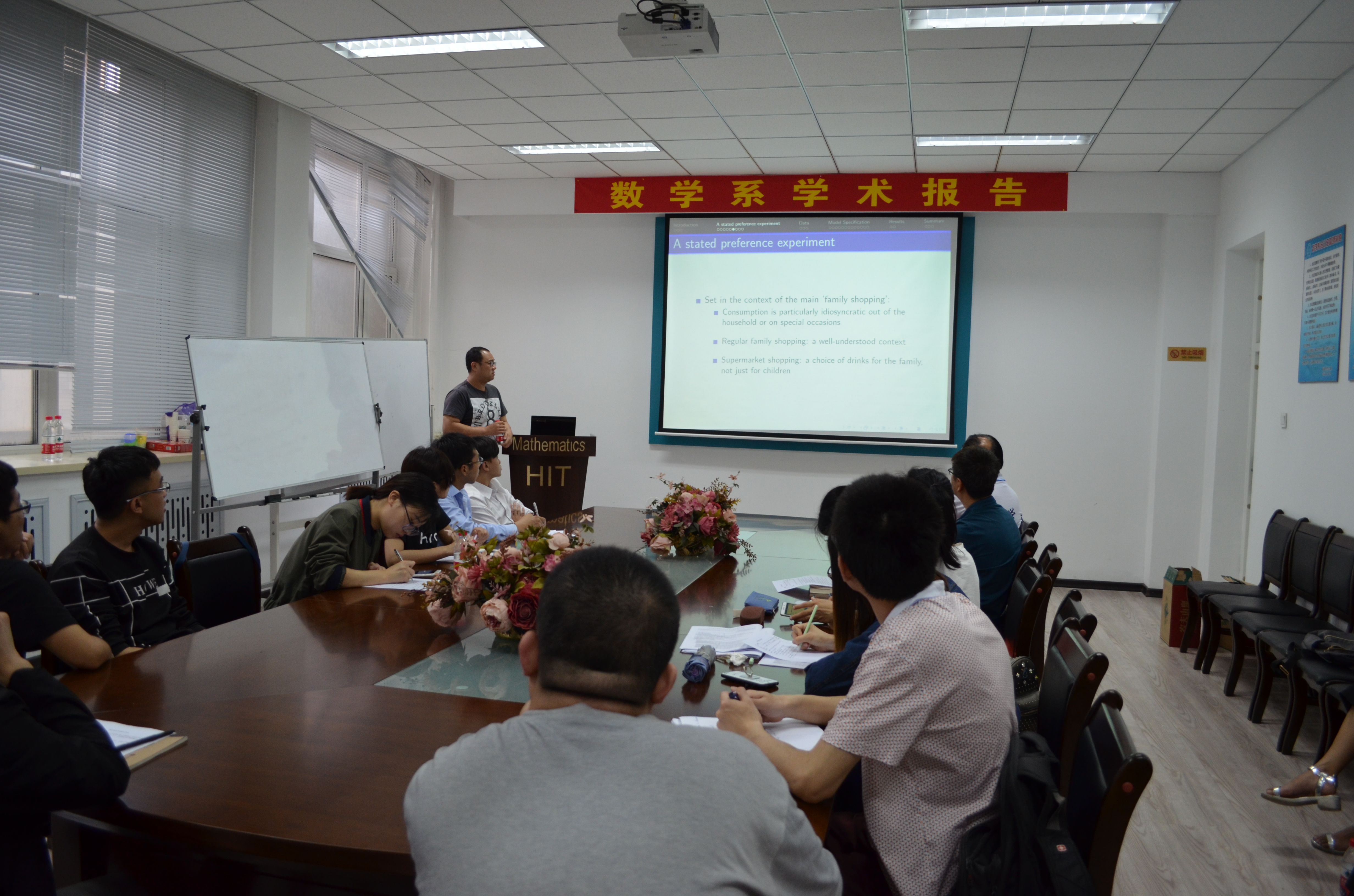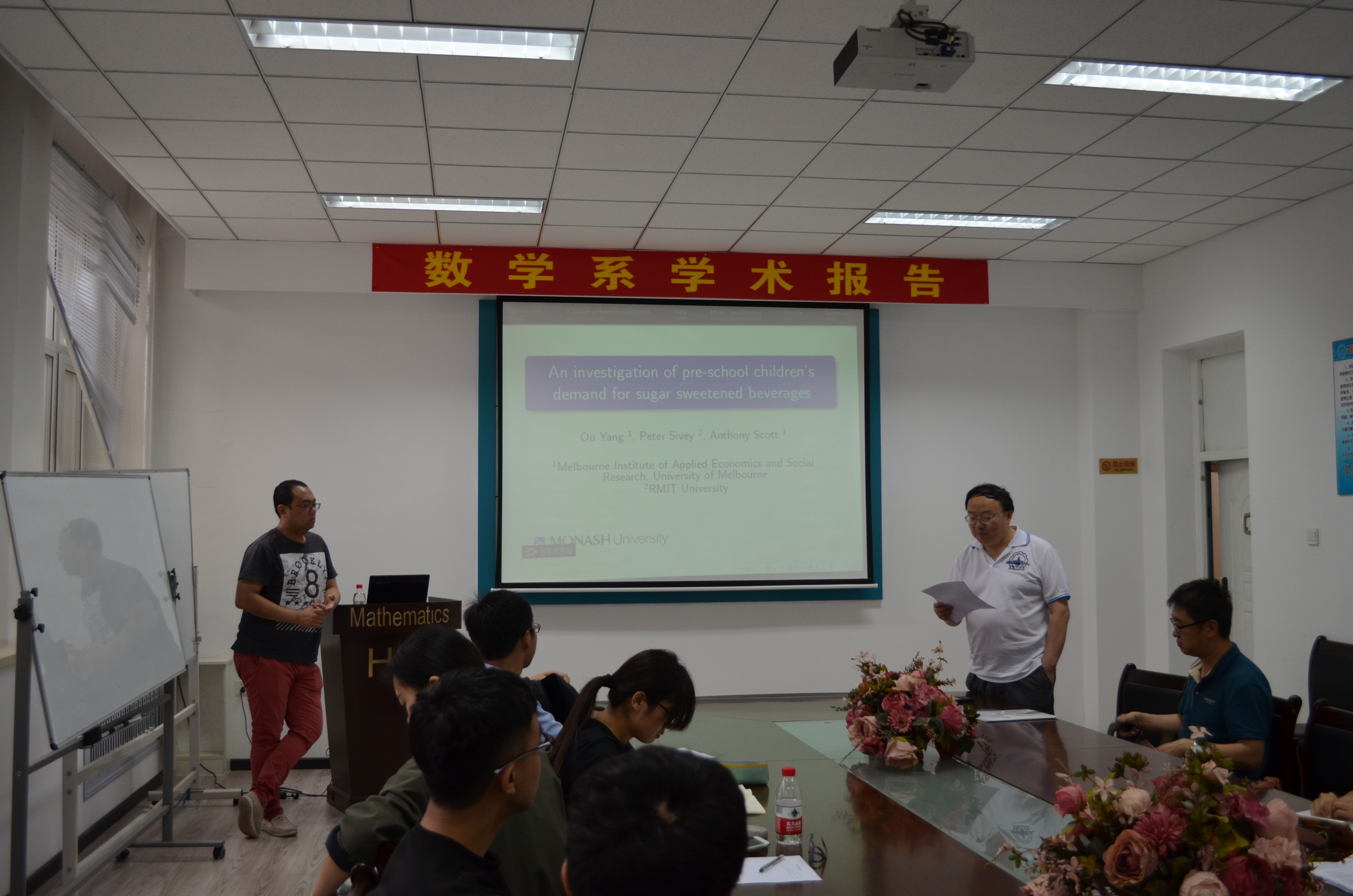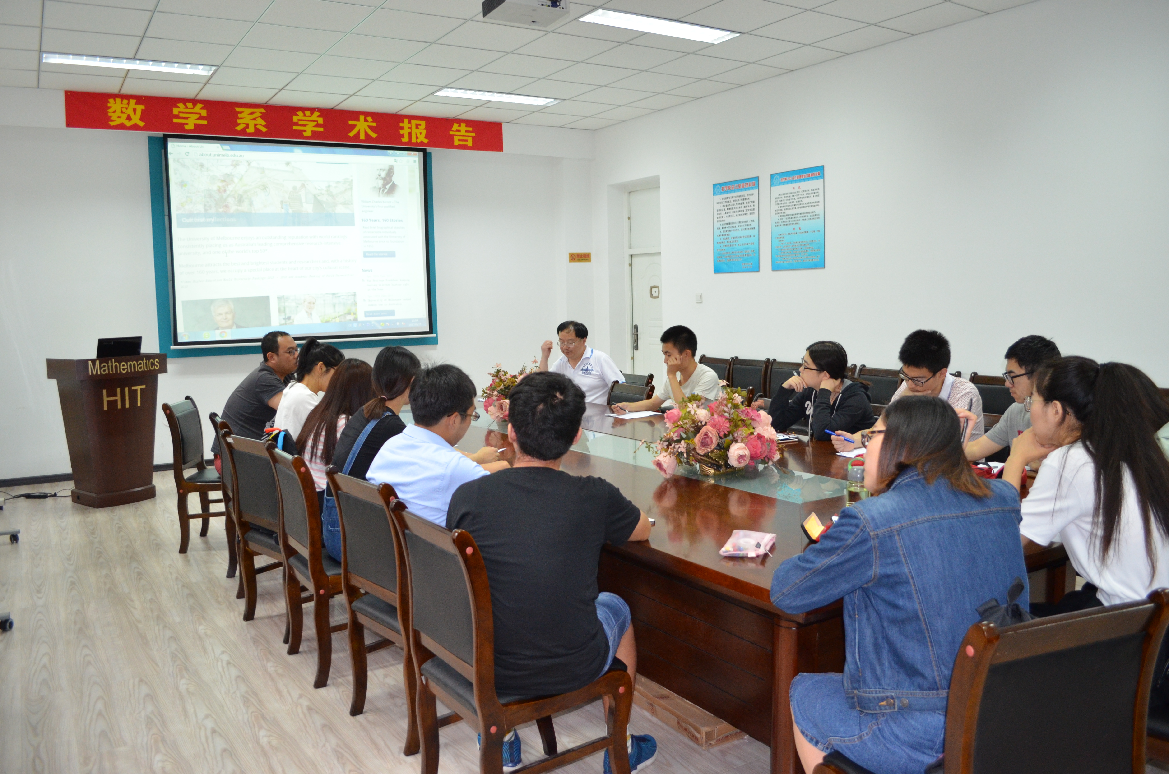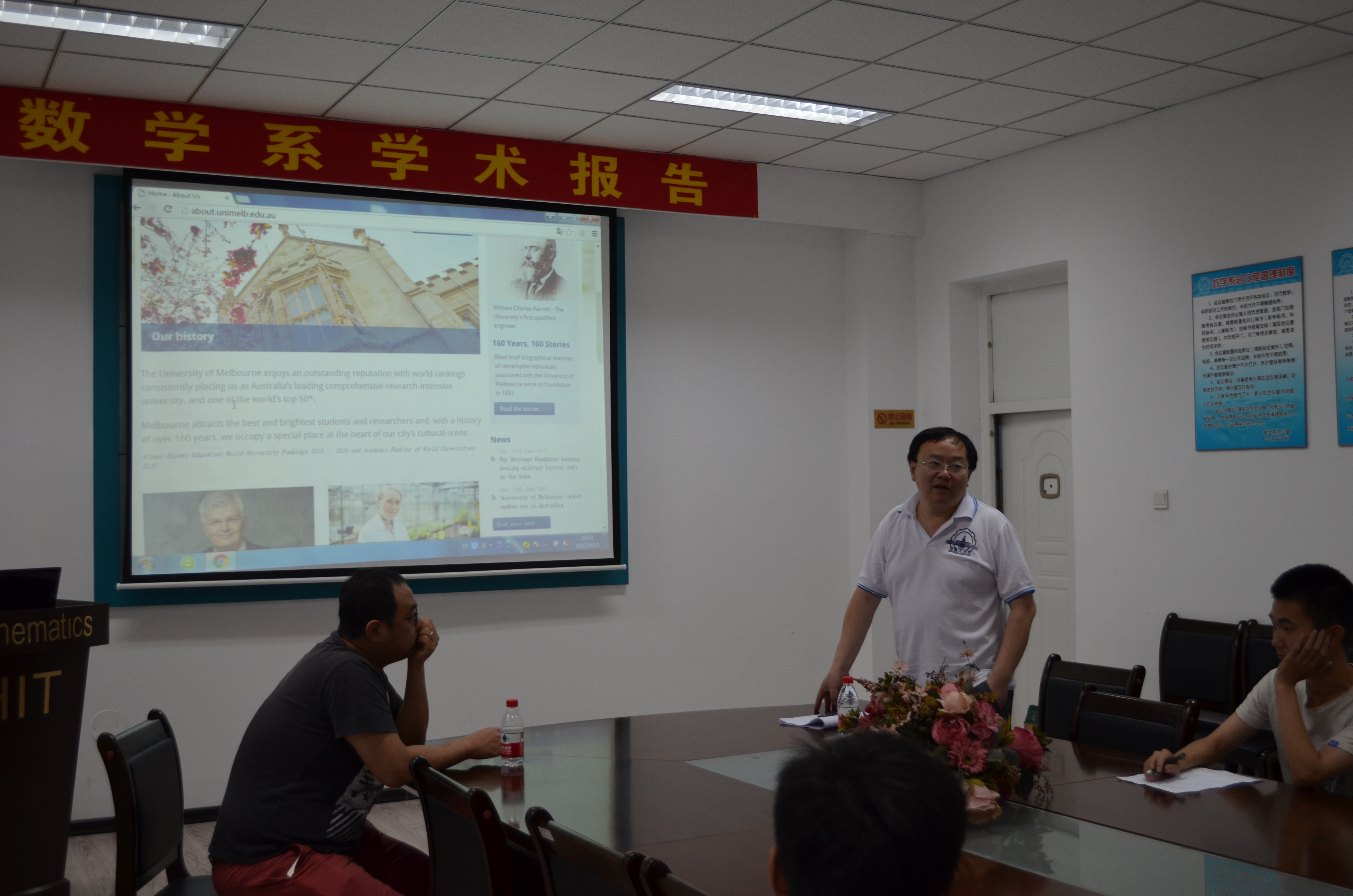 应哈尔滨工业大学数学系田波平教授邀请,墨尔本大学杨欧研究员于2017年6月15日至23日在哈尔滨工业大学数学系进行了学术访问,并于6月20日(周二)及21日(周三)两天上午10:00-11:30、下午15:00-16:30在格物楼503会议室作了四个学术报告,报告题目分别为:1. Environmental policy stringency and industrial productivity growth: An varying coecient cost function approach;2. Alcohol Tax Reform, Binge Drinking and Antisocial/Unlawful Behaviours;3.An investigation of pre-school children’s demand for sugar sweetened beverages;4.浅谈墨尔本大学本科生与研究生教育。报告由田波平教授主持,数学系及来访数学系交流的泰国师生听取了报告,并进行了热烈的讨论。