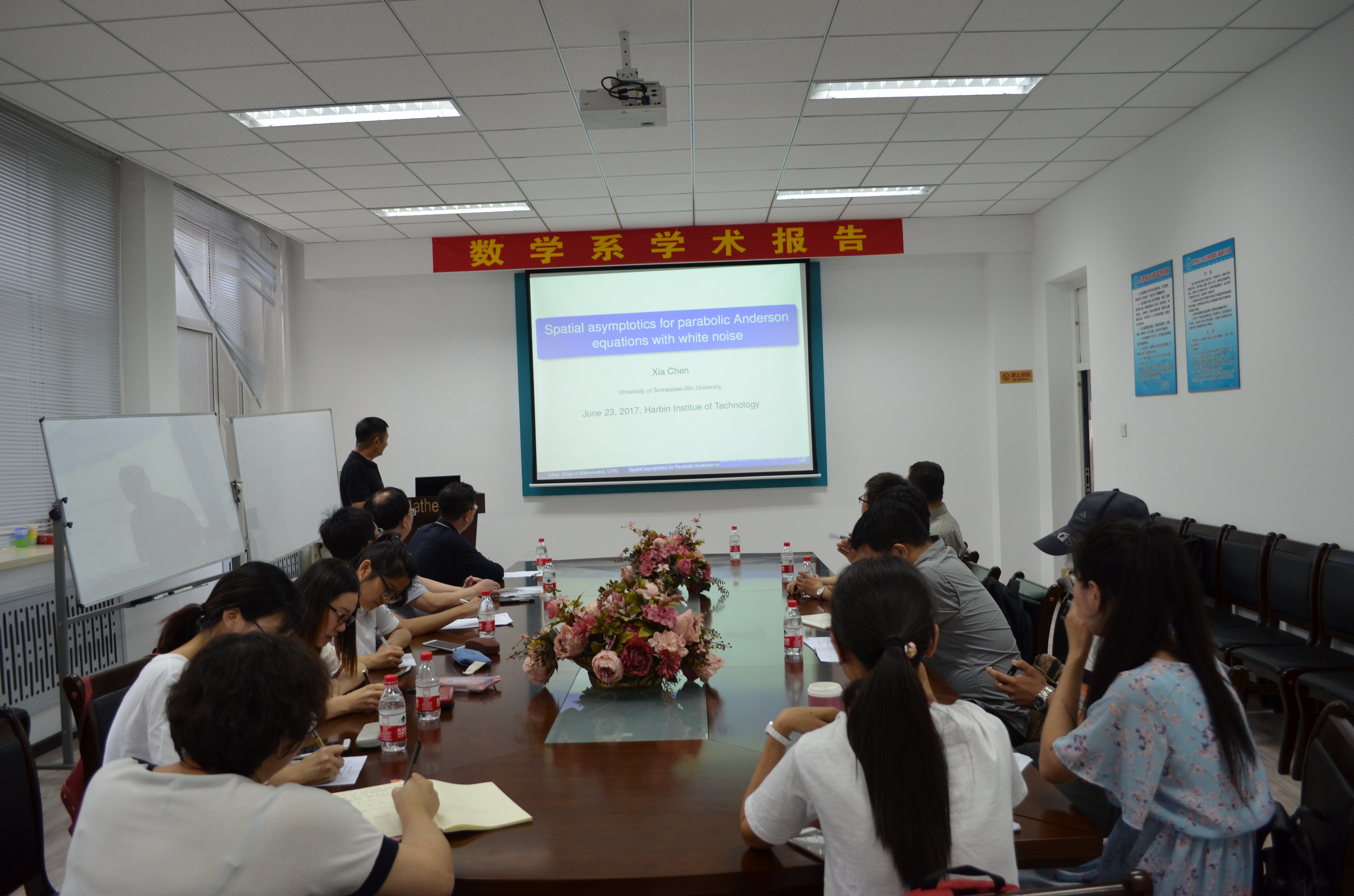 应哈尔滨工业大学数学系田波平教授邀请,吉林大学特聘教授陈夏于2017年6月23日(周五)在哈尔滨工业大学数学系进行学术访问,并于15:00-16:30在格物楼503会议室作学术报告,报告题目为:Spatial asymptotics for the parabolic Anderson models with generalized time-space Gaussian noise。报告由付永强教授主持,数学系20余位师生听取了报告,并进行了热烈的讨论。