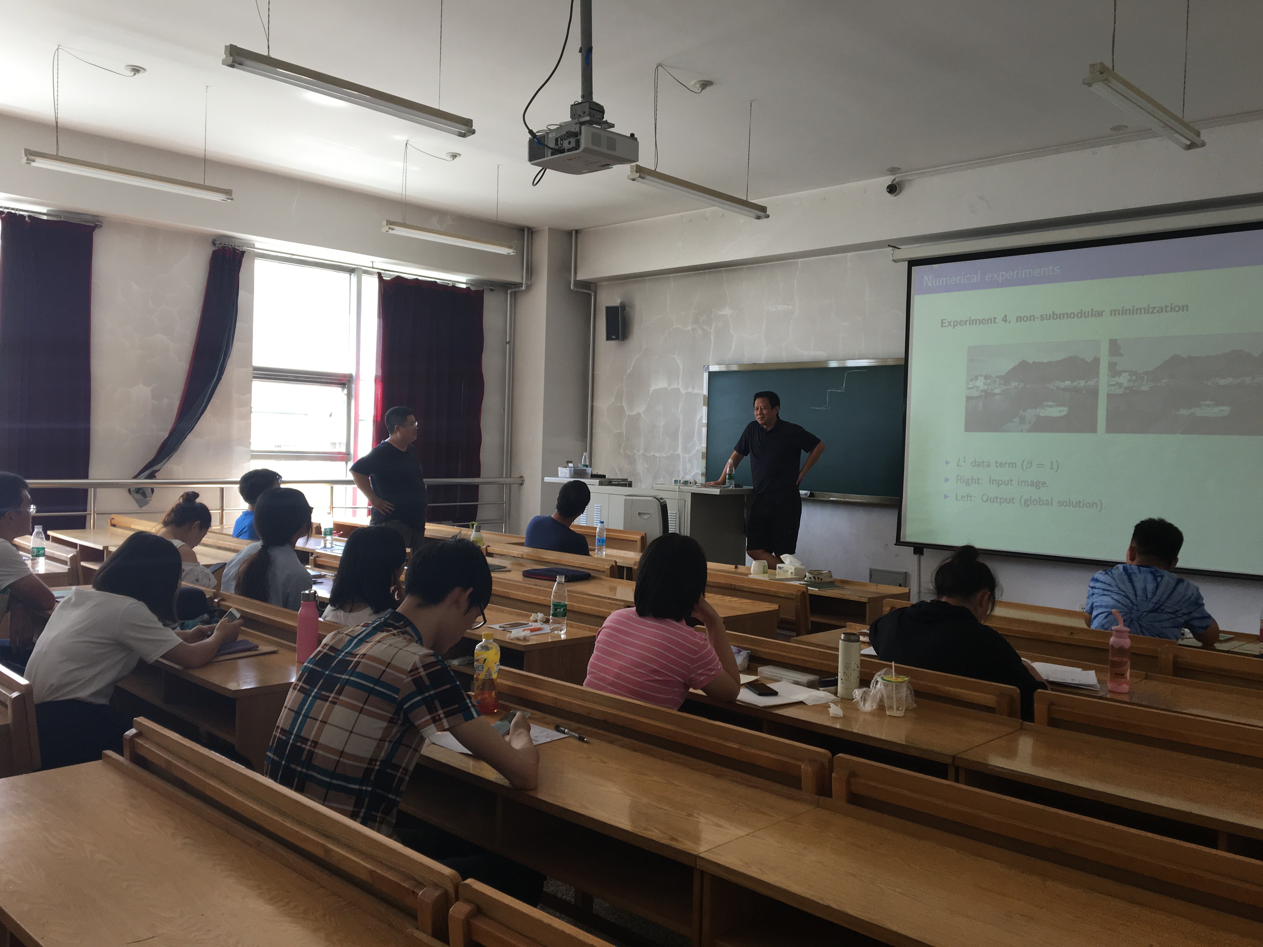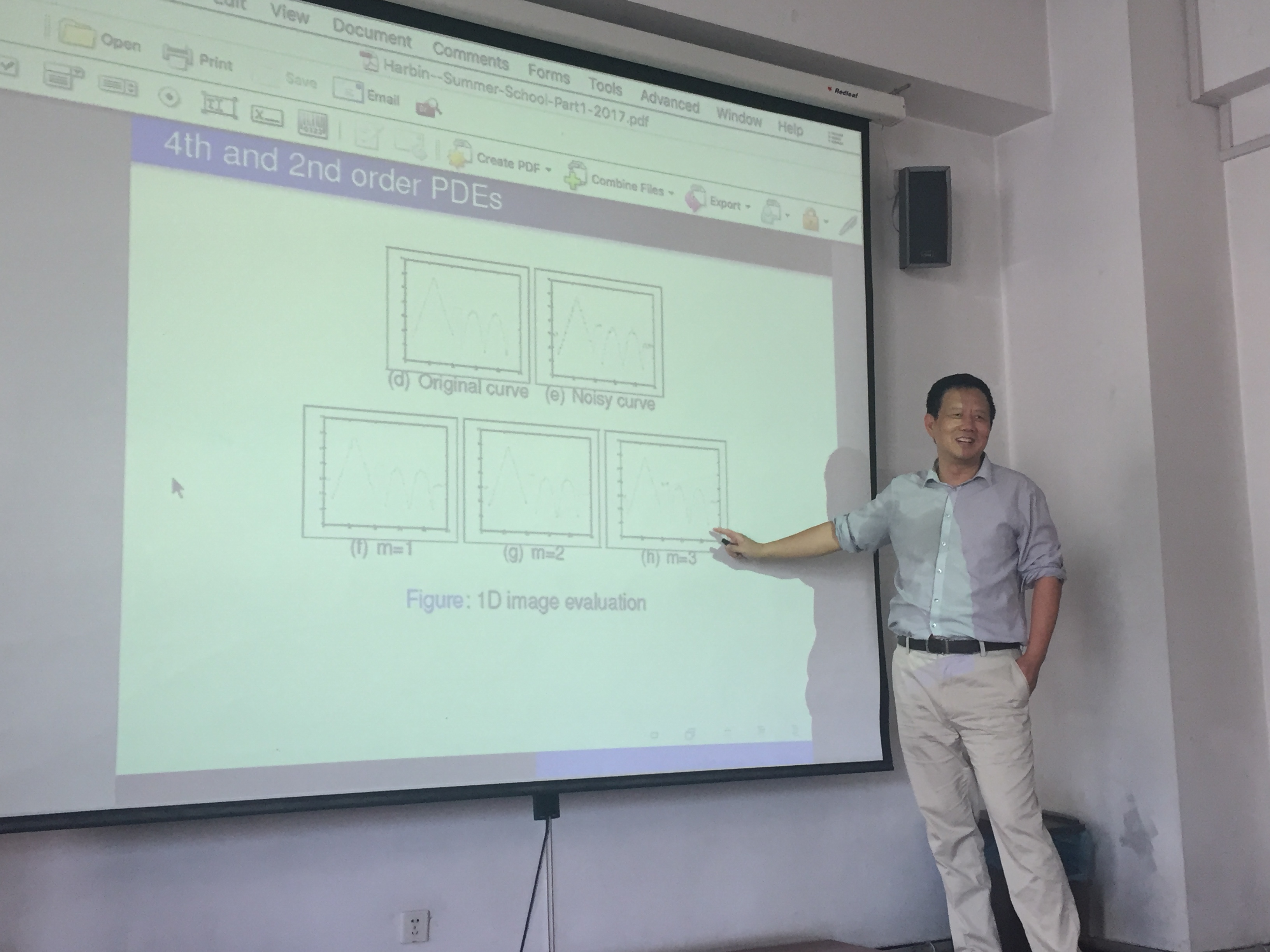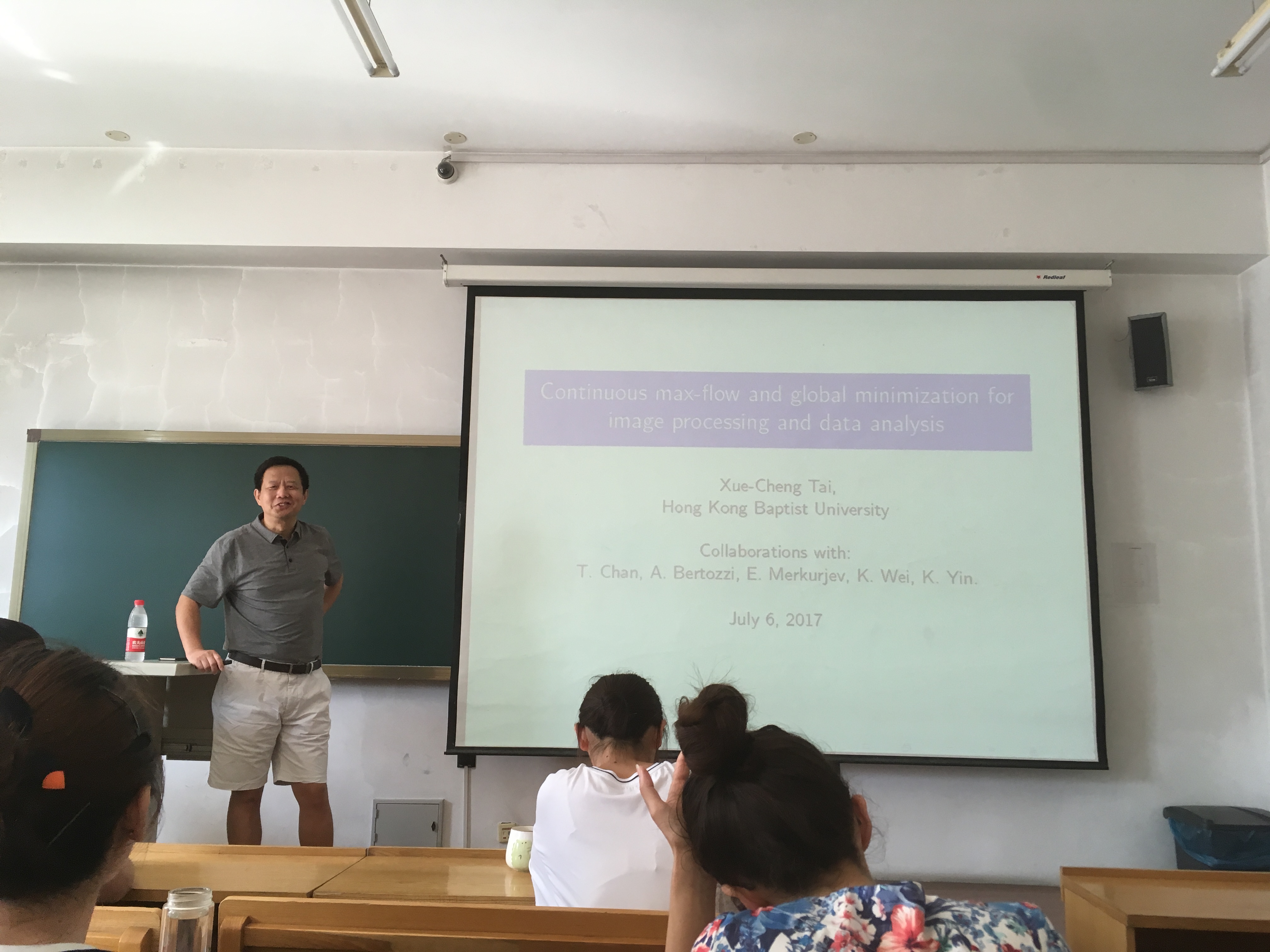 应哈尔滨工业大学数学系的邀请,图像处理领域国际著名学者台雪成教授于2017年7月12-19日访问我校并作图像处理系列报告。来自校内外的学者和师生共50余人参加了此次学术报告和讨论。 此次系列学术报告以“Variational Models and Fast Numerical Schemes in Image Processing and Computer Vision”为主题,着重讨论了图像分割领域中的变分模型和相应的快速算法。台雪成教授从4个方面为与会师生介绍了图像处理领域中的众多问题和解决方法。 第一次报告主要介绍图像处理领域中的基本概念,包括图像恢复、图像分割等内容的定义以及目前面临的核心问题;第二次报告介绍了图像处理领域中的数学基础内容,例如偏微分方程、变分原理、有界变差等内容; 第三次报告回顾了图像处理领域中的经典问题和经典模型,例如用于图像恢复的ROF模型、MS模型、Euler’s Elastica模型等等;第四次报告主要围绕高阶偏微分方程以及其他基于几何性质的图像处理模型; 第五次报告讨论了图像处理的数值模型和方法,从最简单的梯度下降方法开始,台教授一步一步为在座师生介绍了算子分裂方法、AOS格式、对偶算法等传统数值算法;第六次报告则围绕目前较为主流的算法,例如分裂Bregman迭代、增广拉格朗日乘子法等算法进行讨论; 第七次报告台教授主要讲解了目前图像分割领域的新算法,例如分片常数水平集方法、图割方法等;第八次报告台教授介绍了他正在研究的图像分割领域中的前沿问题和方法,以及未来的工作。 每次报告之后,台教授都主持了报告相关问题的学术讨论,回答在座师生的各种问题。与此同时,台教授还主持了2次图像处理相关领域的学术讨论,分别为“高阶变分偏微分方程图像去噪方法”和“图像分割水平集方法”。参加学术报告的师生发言踊跃,交流思想,分享心得,进一步加深了对于图像处理中的数学理论与方法,以及在医学、交通、海洋探测等领域的应用前沿研究状况和最新研究成果的了解。 台教授风趣幽默的性格、深入浅出的课程和严谨认真的研究态度深深的感染了在座听众,使大家获益匪浅,有几位本科生在课后主动联系台教授,有意跟随他攻读博士并在图像处理领域作进一步的研究。同时,在场师生的热情也打动了台教授,他表示将和哈工大数学系建立长期的交流合作。 本次系列报告充分反映了图像分割领域中的数学理论与方法这一主题,以及最新发展和动态,对于进一步促进哈尔滨工业大学与国内外同行之间的交流与合作起到了积极的作用。 此次活动是数学系SCI期刊编委校园行的一部分。