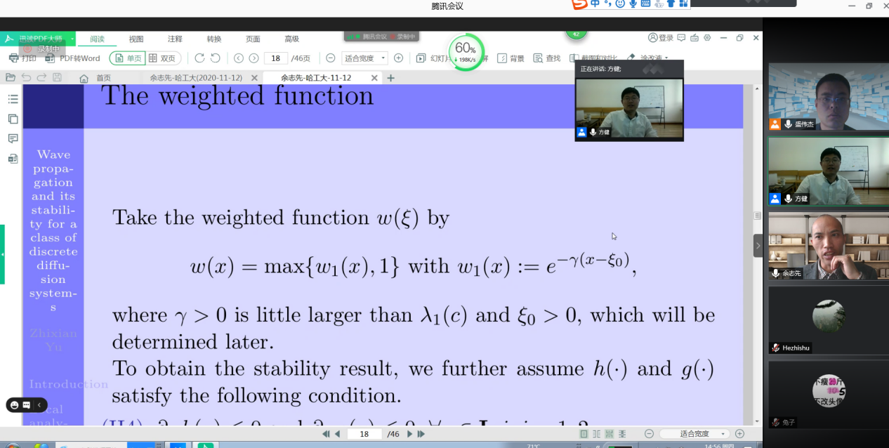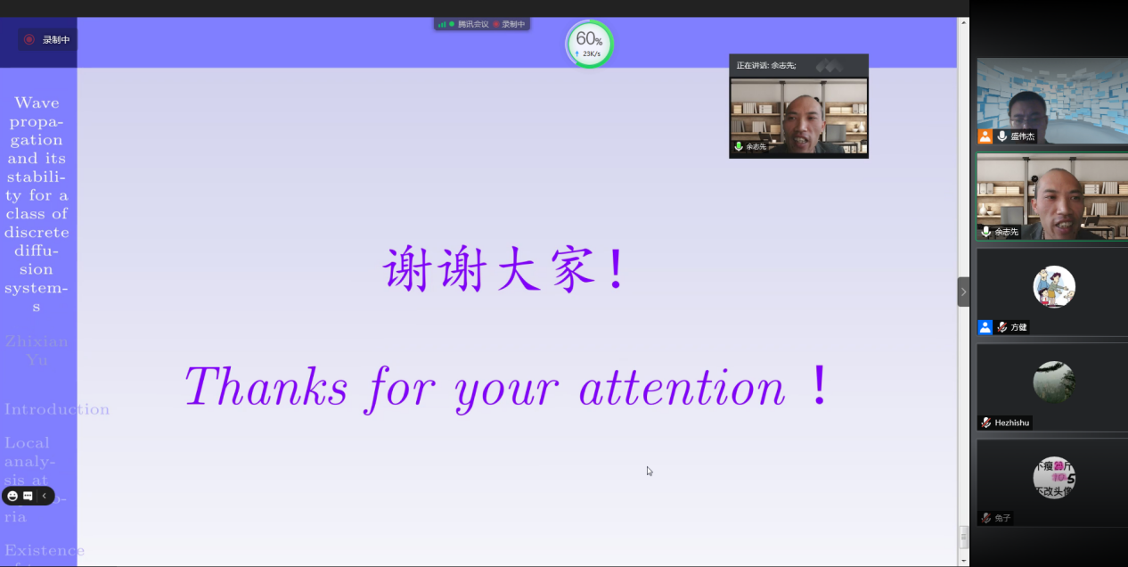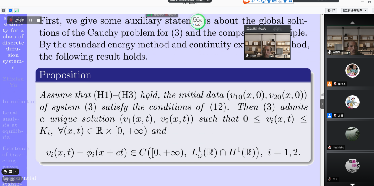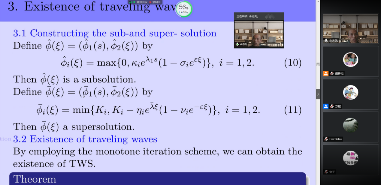 应数学学院盛伟杰副教授邀请,上海师范大学余志先副教授于2020年11月12日下午14:00-15:00为我院师生做了一场在线学术讲座。报告平台为腾讯会议。余志先副教授以Wave propagation and its stability for a class of discrete diffusion systems为题目。余老师的报告介绍了两种群离散扩散系统行波解的存在性和指数稳定性,并将该结果延拓到一般的离散系统,同时对于相关问题的最新进展进行了详细的讲解。报告由盛伟杰副教授主持,近三十名师生参加了此次在线学术活动,并在会议平台与余老师进行了热烈的交流与讨论。