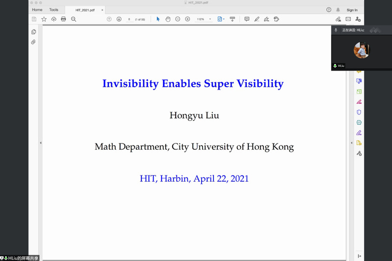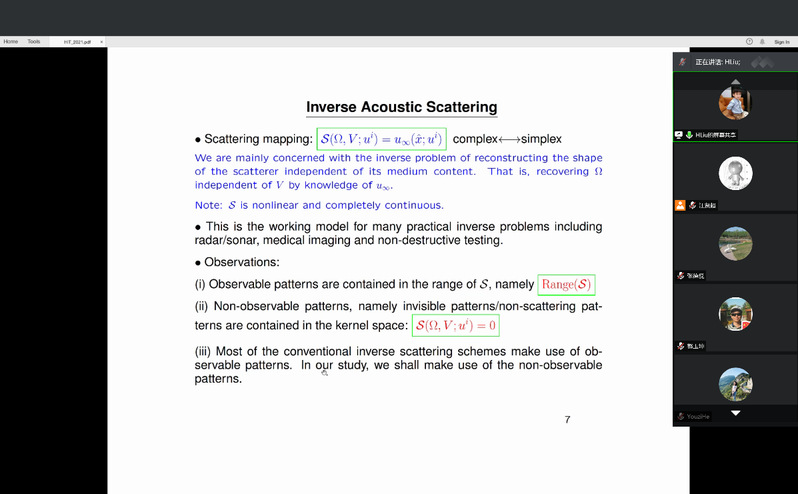 应数学学院郭玉坤副教授和航天学院汪贤超博士的邀请,香港城市大学数学系刘宏宇教授于2021年4月22日上午10:00-11:30为我院做了一场精彩的在线学术讲座。报告平台为腾讯会议。刘宏宇教授的报告题目为:Invisibility enables super visibility.刘教授主要介绍了一类传输特征值问题,分析了特征函数的局部和全局性质,并给出了超分辨率成像的方法。报告由郭玉坤副教授主持,二十余名师生参加了此次在线学术活动,并在会议平台与刘宏宇教授进行了热烈的交流与讨论。